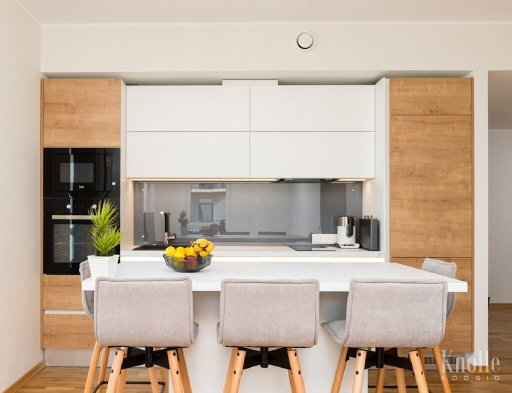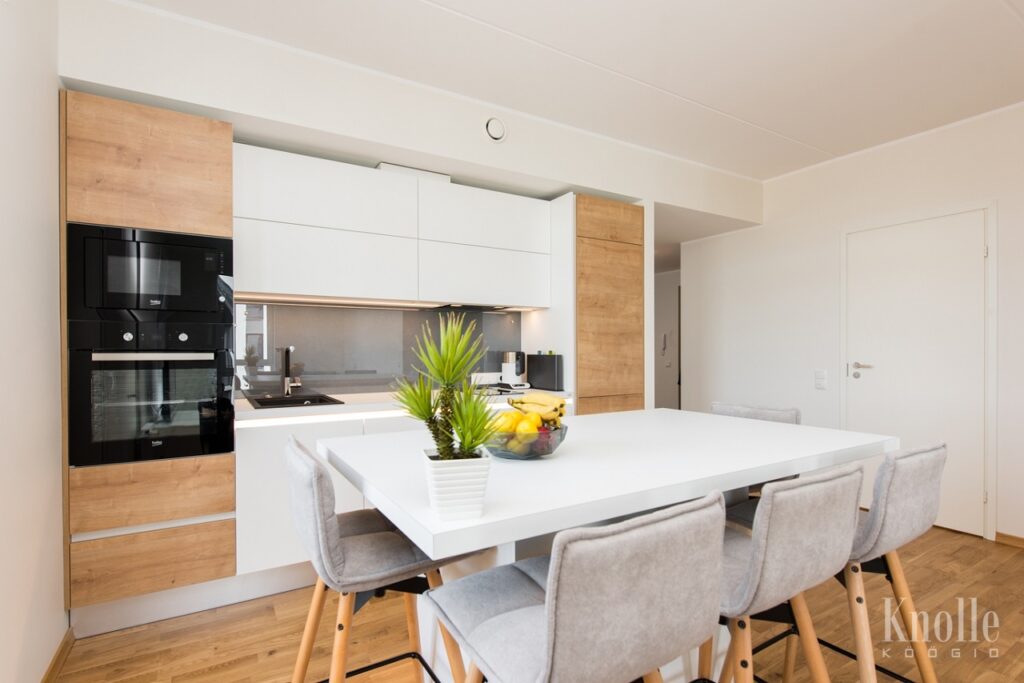 Köögimööbli tööpind on laminaat W1000. Uksed ja sahtlite esipaneelid on MDF-ist, mis värvitud valge poolmatt värviga, postid ja saare esipaneel melamiinist H3303. Taustaplaadiks on kirgas klaas. Käepide – Laguna L ja C alumiiniumprofiiliga, ülemised kapid on alt ja tip-on avatavad. Valgustuseks on sensorlülitiga süvistatud LED-riba.